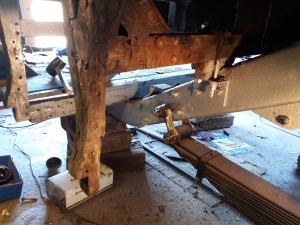 The last few days have been concerned with removing the offside wheel housing and mudwing. I found the timber in the wheelarch framing to be in much better condition than the nearside and it looks savable. Today was spent removing the remains of the steel flitchplates that join the floor bearer to the wheelarch timbers. The floor bearer at this location is in fairly rough condition so I will make larger steel reinforcement plates to extend further into the centre of the body.